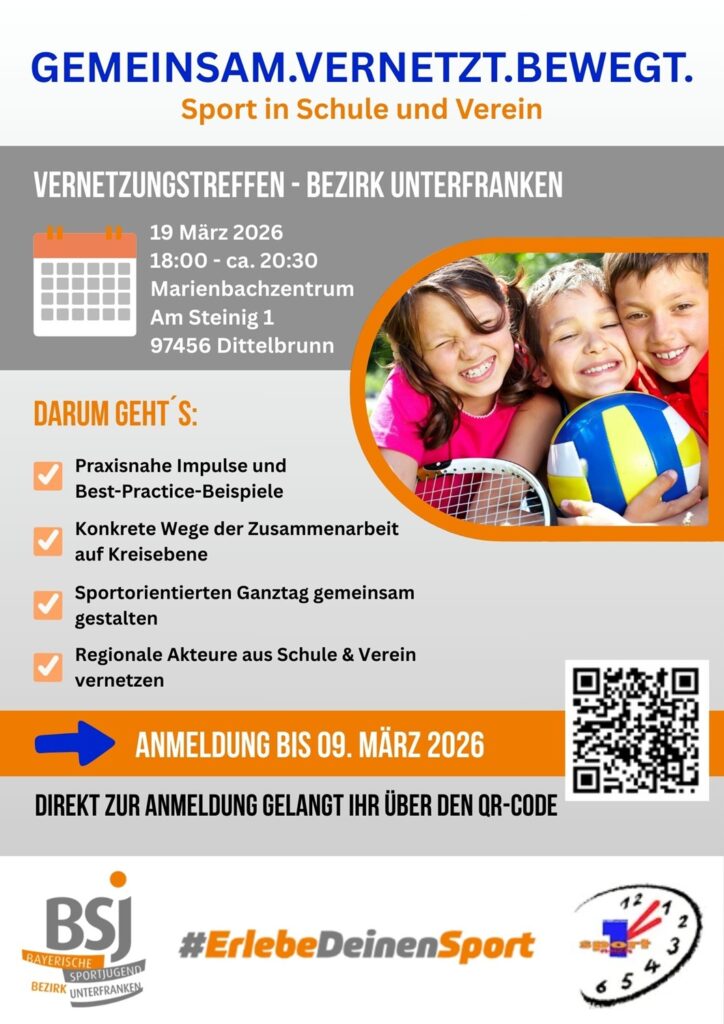 “Gemeinsam.Vernetzt.Bewegt. — Sport in Schule und Verein” am 19.03.2026 von 18:00 bis ca. 20:30 UhrMarienbachzentrum (Am Steinig 1 — 97456 Dittelbrunn)