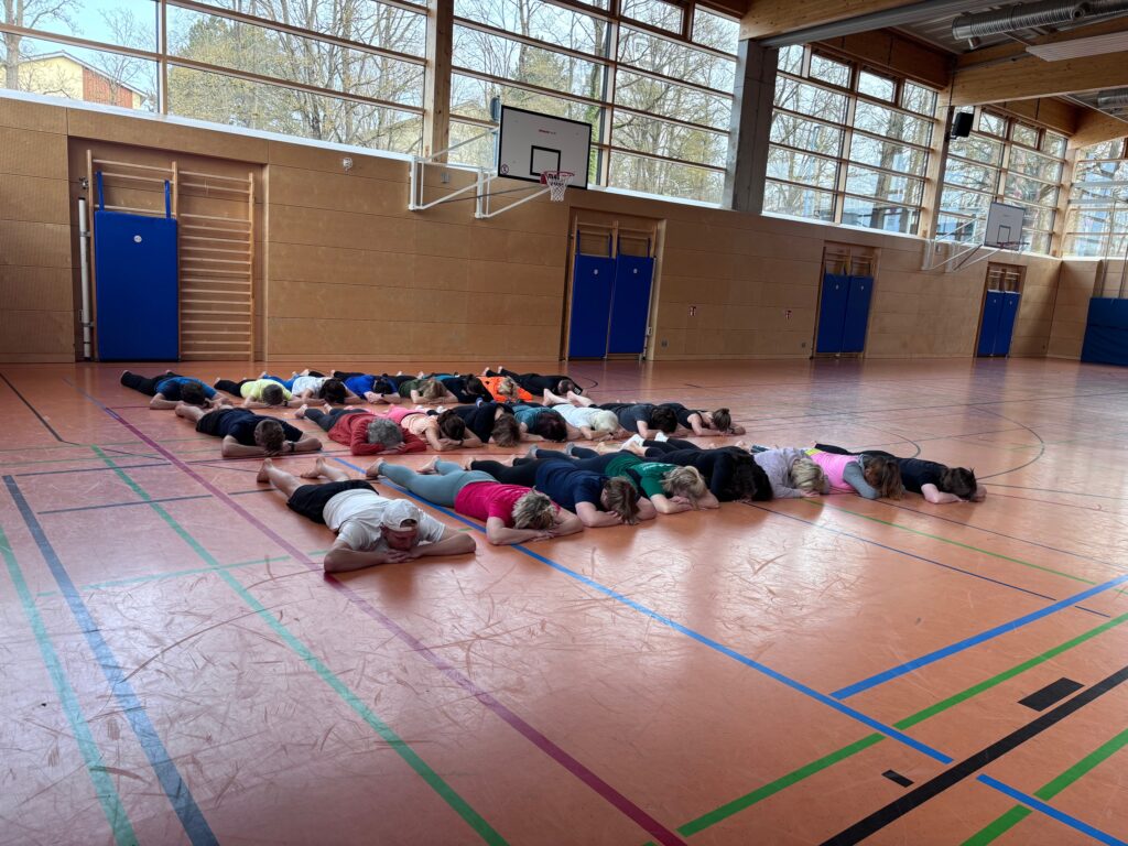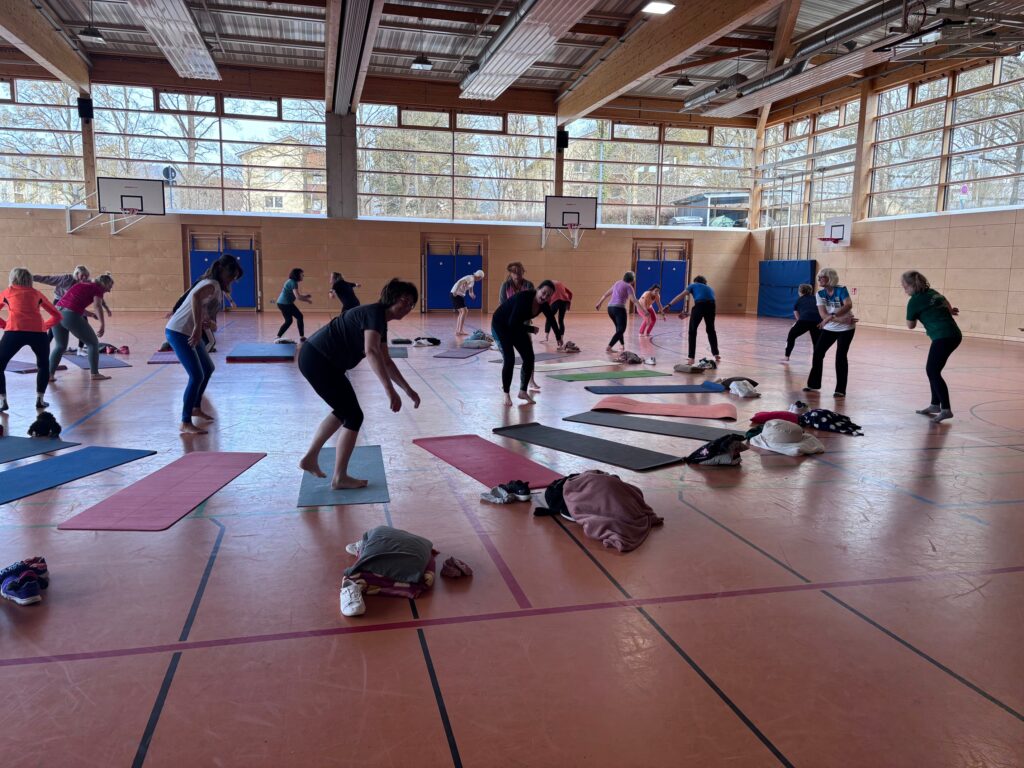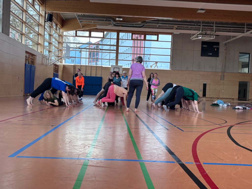 Mit Doris Bach­fi­scher konnte hier wie­der eine her­vor­ra­gende Refe­ren­tin in Sachen Hal­tung und Bewe­gung gewon­nen wer­den. Hier wurde auch gleich ein sanf­ter Start mit einem spie­le­ri­schem Warm-up, sowie gesund­heits­ori­en­tier­ten Locke­rungs­übun­gen hin­ge­legt. Siche­rer Stand, also Balance, Teil­be­rei­che aus Yoga und Streching, gefolgt von Übun­gen an der Sport­hal­len­wand, sowie zahl­ei­chen Varia­tio­nen auf der Iso­matte, wur­den den 24 Teil­neh­mern: Innen ver­mit­telt und zusam­men fach­kun­dig ange­lei­tet. Natür­lich durf­ten hier auch keine kind­ge­rech­ten Spiel­va­ri­an­ten feh­len, die hier in 2er oder 3er Grup­pen absol­viert und mit Spaß moti­viert von allen durch­ge­führt.