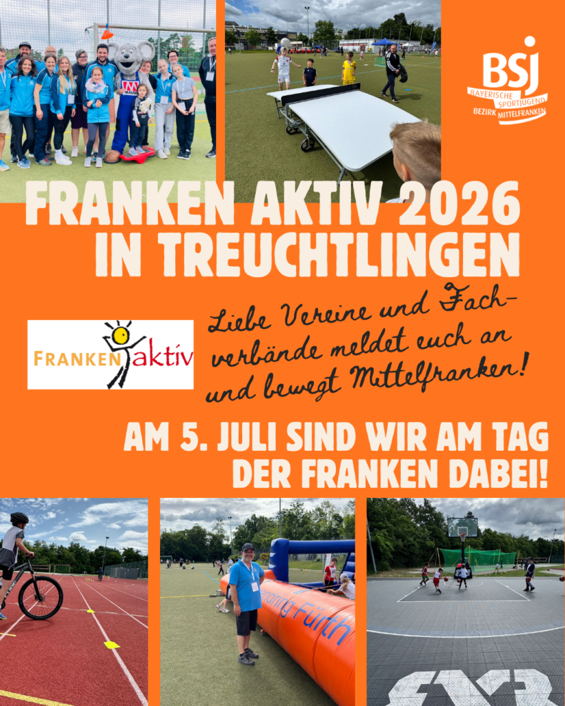 das große Spiel- und Bewegungsfest „Franken aktiv“ findet 2026 am Sonntag, den 5. Juli 2026, im Rahmen des Tags der Franken, in Treuchtlingen statt.