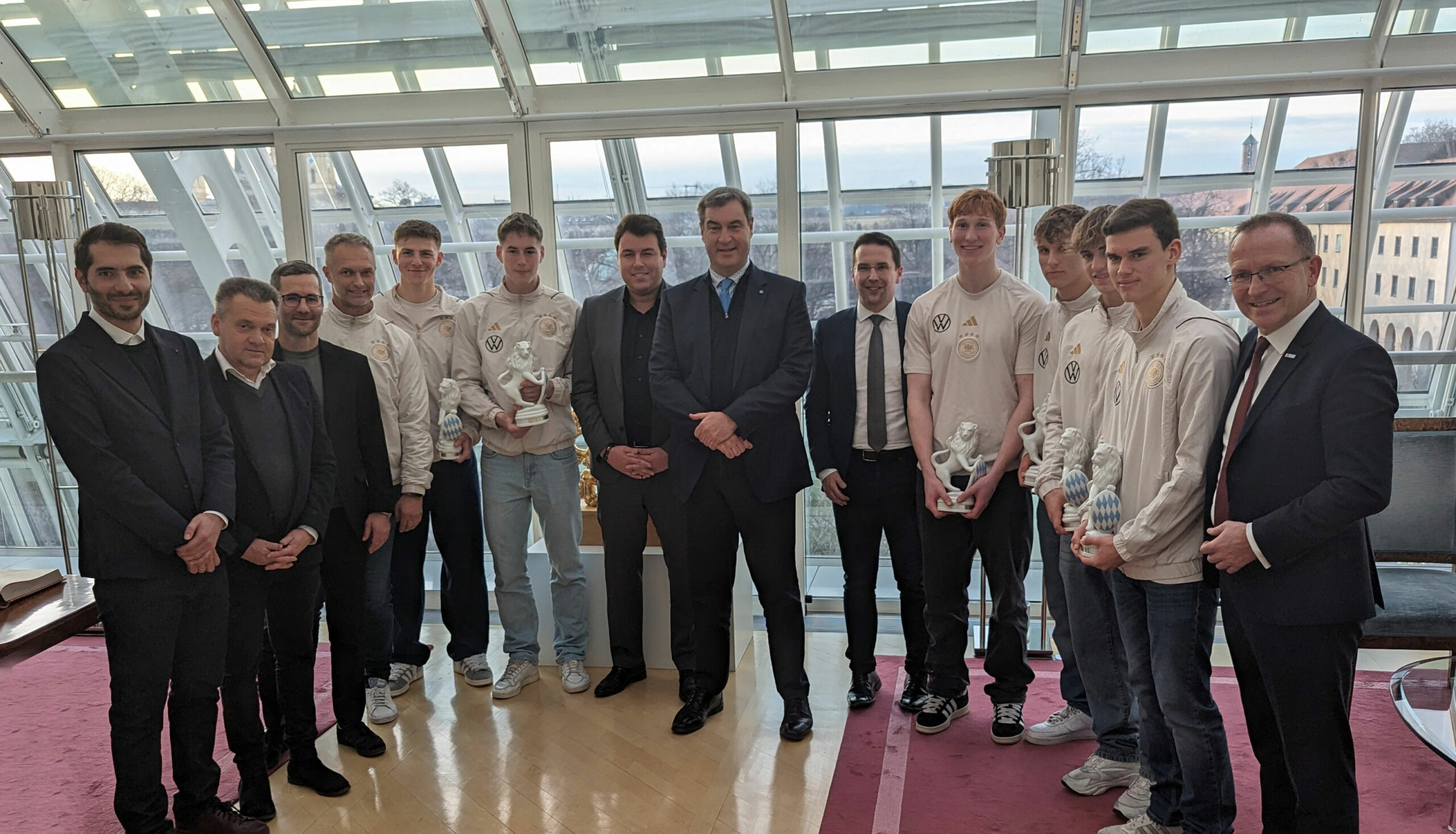 Ministerpräsident Markus Söder zeichnete bei dem Empfang am 30.01. in der Bayerischen Staatskanzlei die herausragenden Leistungen der sechs bayerischen Fußballer und Trainer Christian Wück aus.