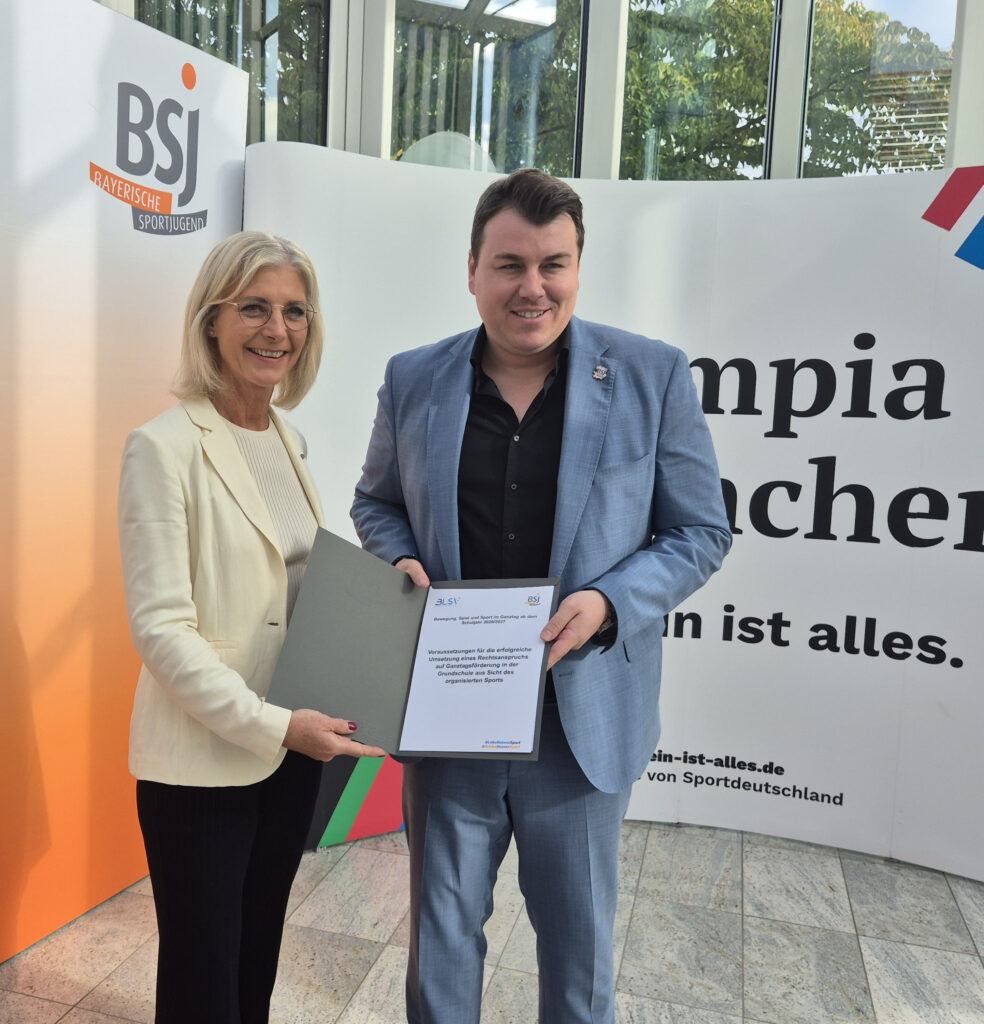Das BSJ-Positionspapier mit seinen sieben Punkten zur optimalen Verzahnung von organisiertem Sport und der Ganztagesförderung in der Grundschule wurde zum Auftakt der Kinder- und Jugendsportkonferenz, KiJuKo, an die Vertreterin der Bayerischen Staatsregierung, Staatsministerin Ulrike Scharf, übergeben. Die KiJuKo ist Bayerns größte Fortbildungsveranstaltung im Kinder- und Jugendsport und befasste sich dieses Jahr mit der Bewegungsförderung von Kindern in Kindergarten und Grundschule, die die Thematik des ab dem Schuljahr 2026/27 kommenden Rechtsanspruchs auf Ganztagsbetreuung miteinschließt. Die Bayerische Jugendministerin besuchte als Schirmherrin die Veranstaltung und nahm das Positionspapier persönlich in Empfang.